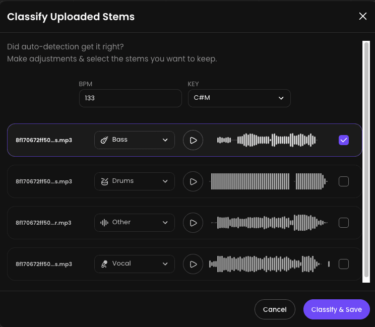 Select Stems to Keep: Use the checkbox on the right side of each entry to select which stems you want to save and use in your project. Unchecking a box will discard that stem.