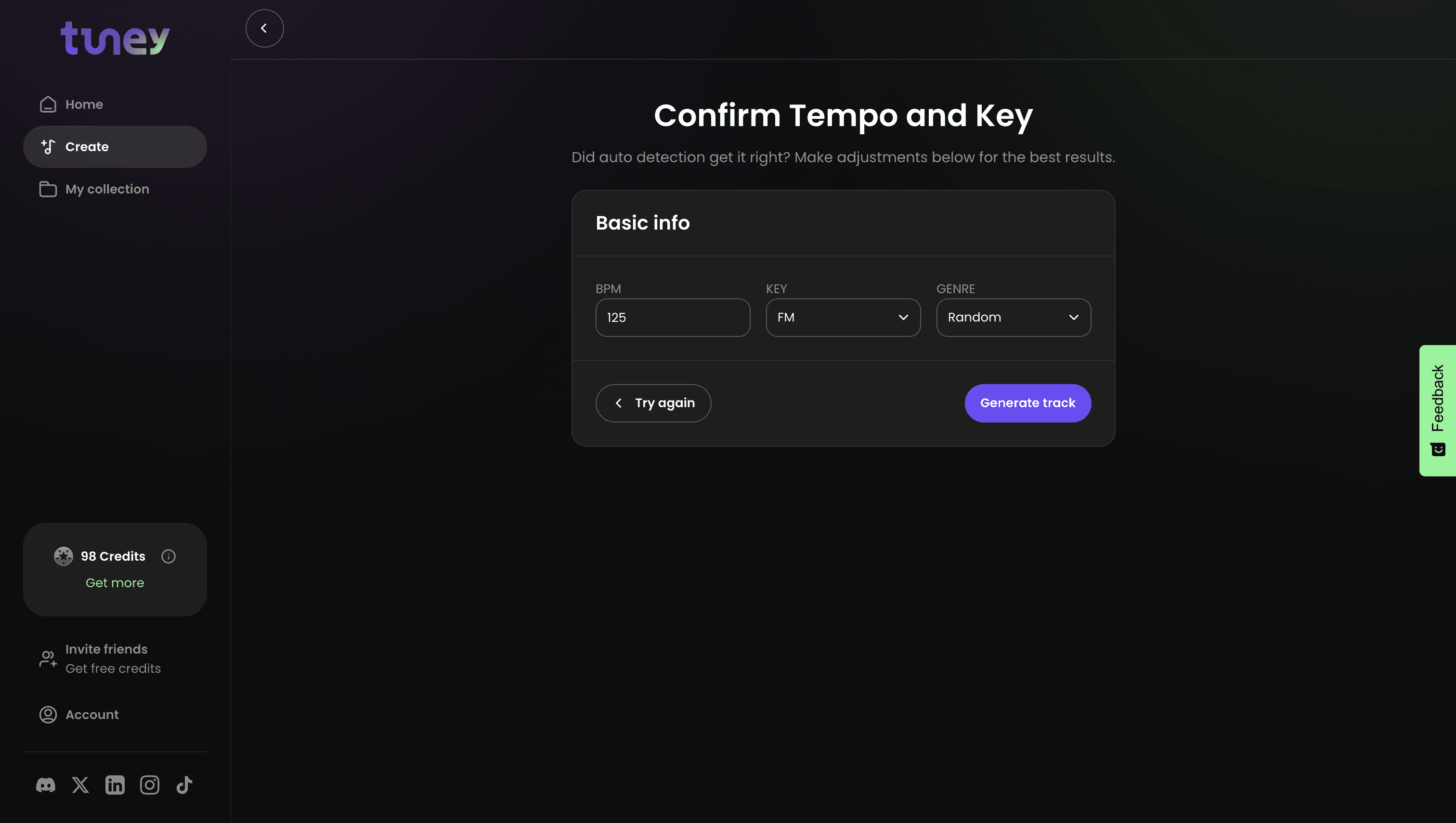 After you select or upload a file, Tuney will analyze it and extract the vocal if you upload a full song. Confirm the analyzed key and BPM, and select a genre for your remix (you will be able to change this after hearing initial results as well).