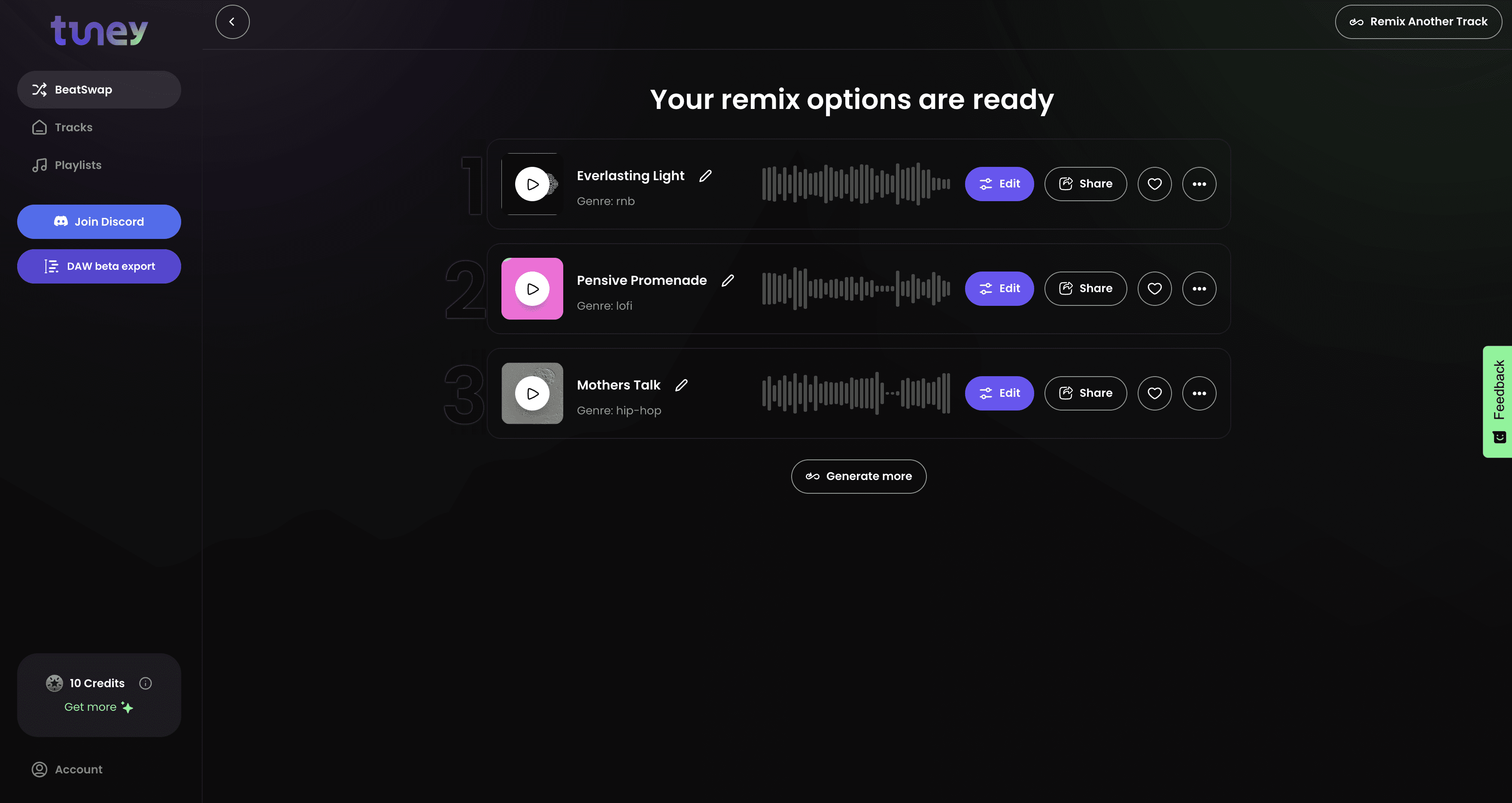 When you first remix your song, Tuney will generate 3 results. If you want to hear the track with a different genre, you can click on "Generate more" and select the genre you want or keep it "Random".