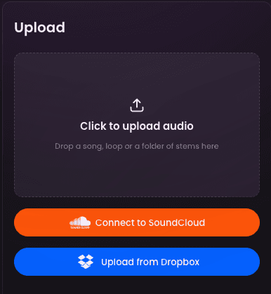 In addition, the “Upload” Tab allows you to directly connect to your SoundCloud and Dropbox accounts. These connections allow you to upload samples and songs directly from your accounts, streamlining the stem separating and remixing process.