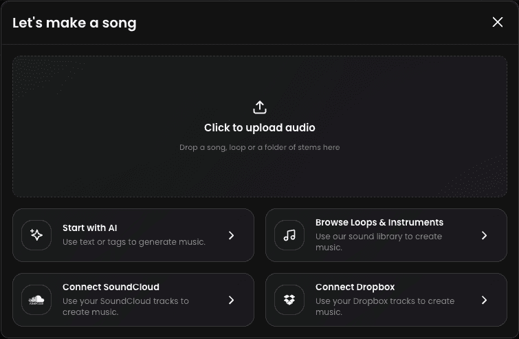 To get started, select one of Tuney’s various ways to create a new project: