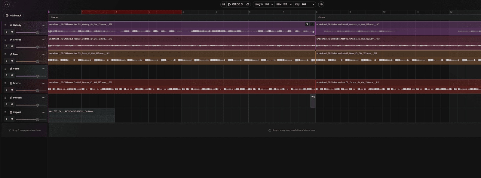 Once you are satisfied with the initial idea, whether it’s a generated song, loop or uploaded vocal, click "Move to Grid" or drag the element onto the grid to move to the next step.