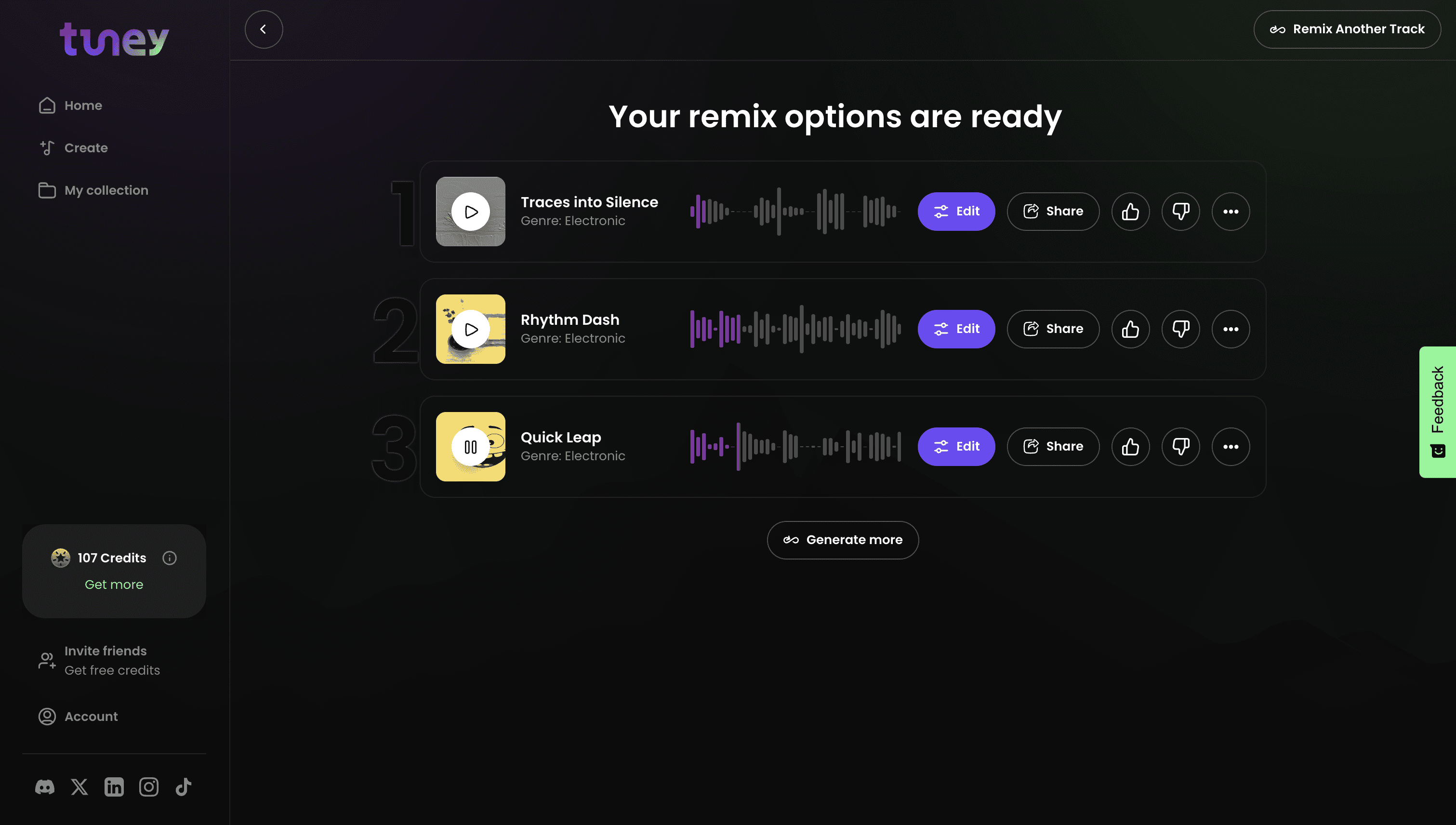 When you first remix your loop, Tuney will generate 3 results. If you want to hear the track with a different genre, you can click on "Generate more" and select the genre you want or keep it "Random".