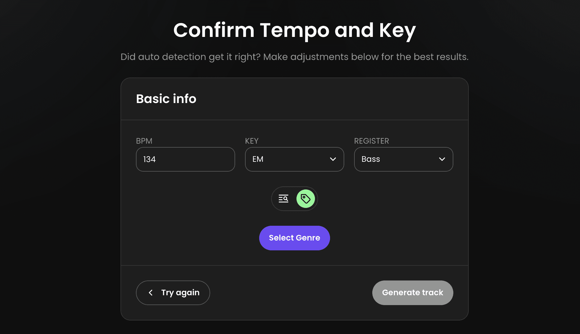 Tuney will auto-detect your sample's BPM, Key, and Register. Make adjustments as needed to generate the best results. Next, type in a text prompt to describe your desired track, or select a genre. Finally, hit "Generate track" to start generating results!